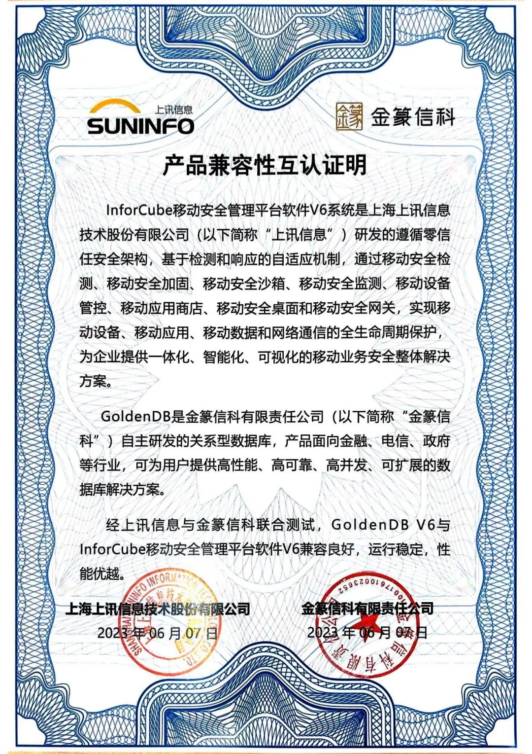 經(jīng)雙方聯(lián)合測試, InforCube移動安全管理平臺軟件 V6與GoldenDB V6兼容良好、運(yùn)行穩(wěn)定、可滿足用戶產(chǎn)品兼容性要求。雙方也將基于適配互認(rèn)證工作成果共同開拓金融、政府等行業(yè),為企業(yè)移動數(shù)字化生態(tài)建設(shè)注入新動能。