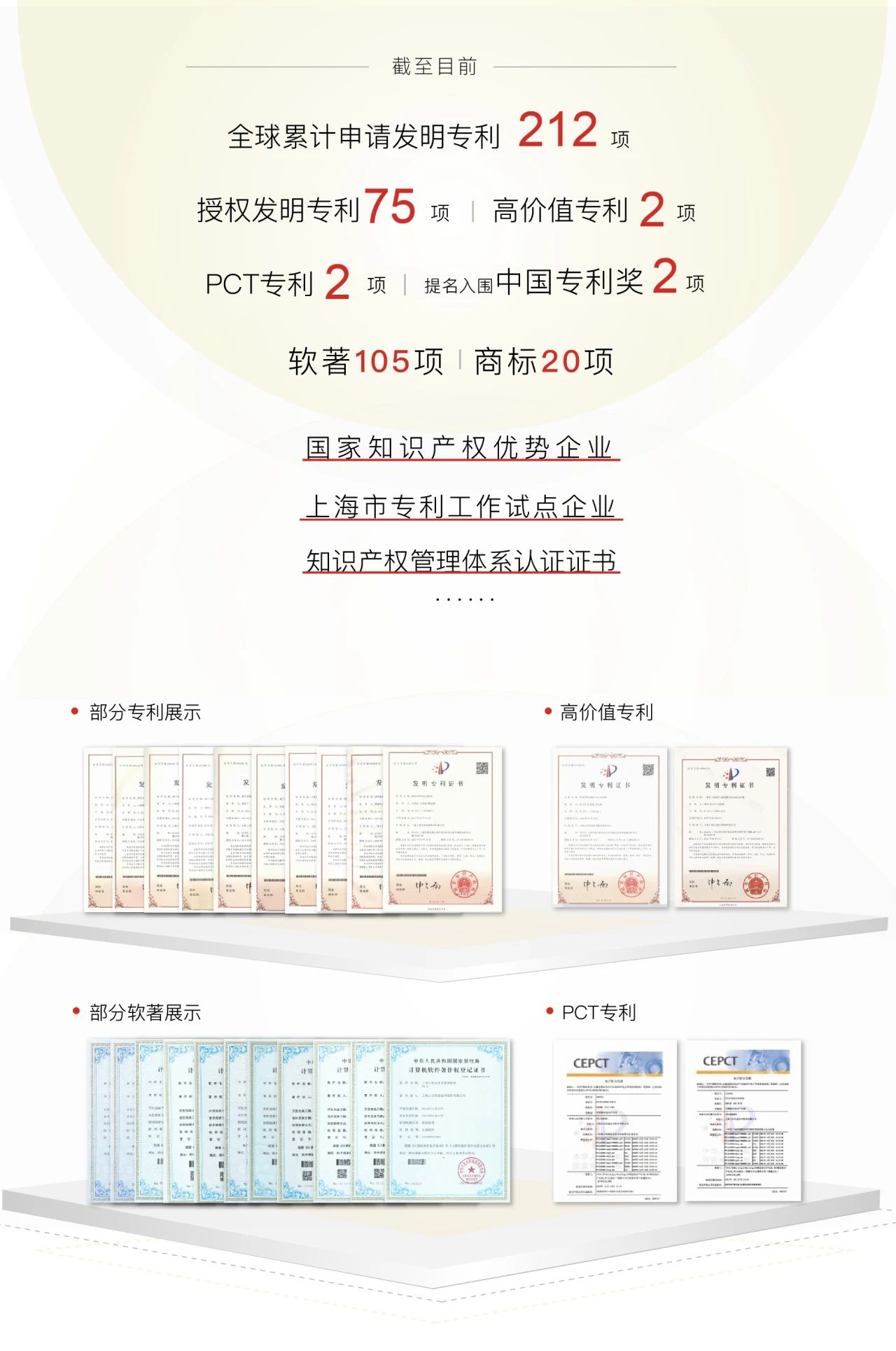 經(jīng)過(guò)多年的創(chuàng)新實(shí)踐與沉淀,上訊信息在知識(shí)產(chǎn)權(quán)創(chuàng)造、運(yùn)用、保護(hù)、管理能力上全面發(fā)展,取得了諸多成果。先后獲得“上海市專利工作試點(diǎn)企業(yè)”認(rèn)定、“知識(shí)產(chǎn)權(quán)管理體系認(rèn)證”證書。全球累計(jì)申請(qǐng)發(fā)明專利 212項(xiàng),授權(quán)發(fā)明專利 75項(xiàng)、高價(jià)值專利2項(xiàng)、PCT專利2項(xiàng),提名入圍中國(guó)專利獎(jiǎng)2項(xiàng),獲得軟著105項(xiàng)、商標(biāo)20項(xiàng)。自主掌握多項(xiàng)關(guān)鍵核心技術(shù),為公司的高質(zhì)量可持續(xù)發(fā)展提供了強(qiáng)有力的技術(shù)支撐。