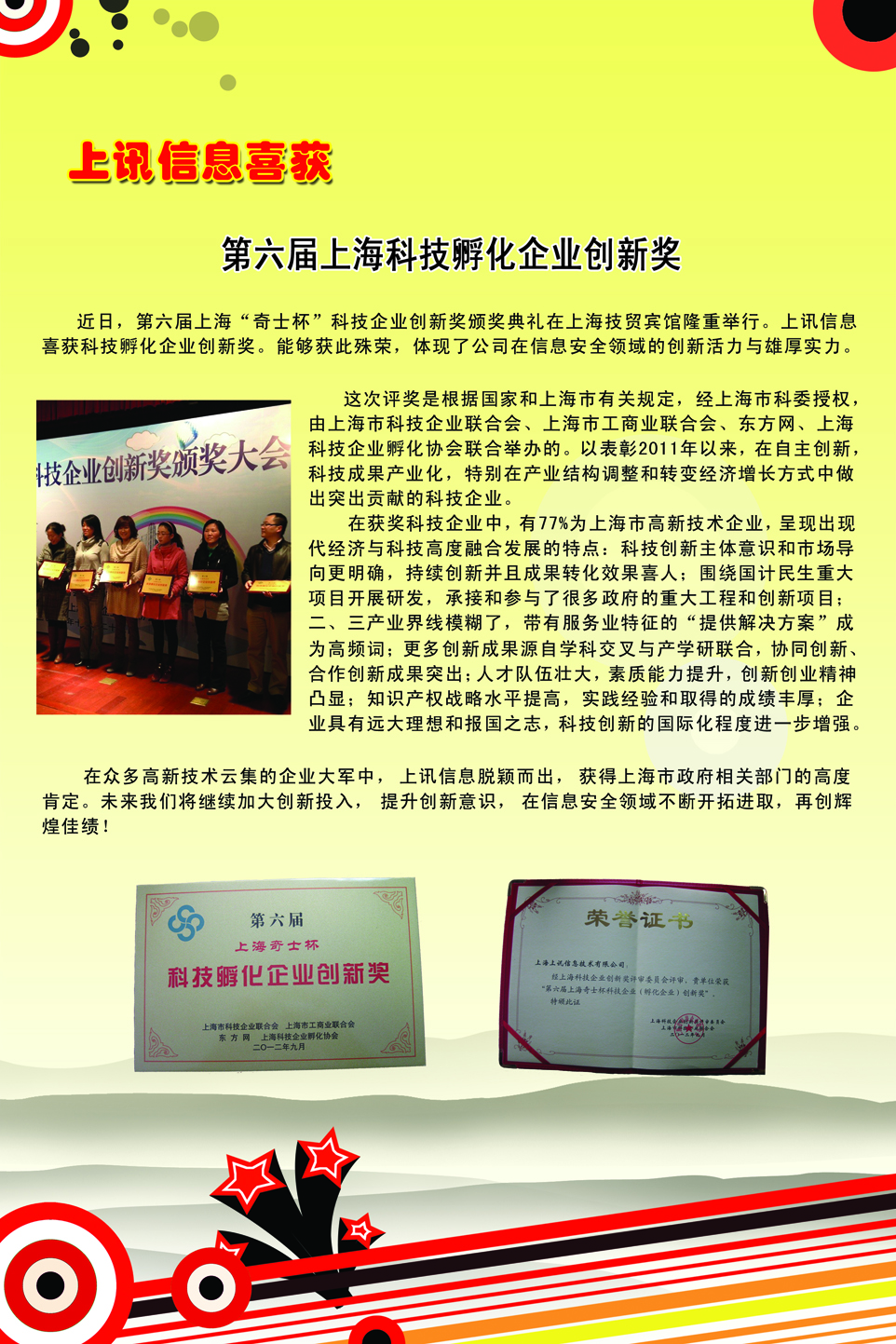上訊信息喜獲第六屆上海科技孵化企業(yè)創(chuàng)新獎(jiǎng)