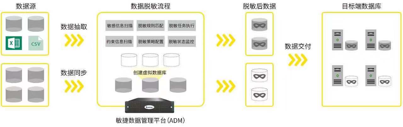 ADM內(nèi)置雙重脫敏模式,基于虛擬數(shù)據(jù)庫的脫敏方式,將數(shù)據(jù)交付與脫敏完全自動(dòng)化;數(shù)據(jù)抽取脫敏方式靈活支持多種脫敏源。