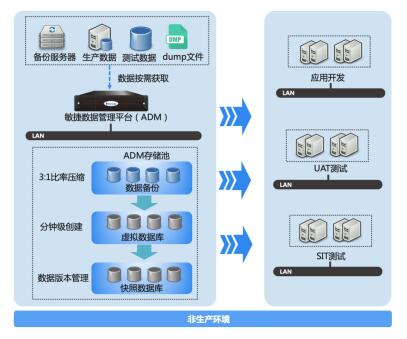 (3)ADM存儲(chǔ)池自帶壓縮功能,可以實(shí)現(xiàn)存儲(chǔ)即壓縮,采用數(shù)據(jù)庫(kù)虛擬化交付,一份數(shù)據(jù)可以同時(shí)交付給不同的環(huán)境使用,并且數(shù)據(jù)相互獨(dú)立、互不干擾。壓縮和數(shù)據(jù)庫(kù)虛擬化技術(shù),使得數(shù)據(jù)使用的存儲(chǔ)開(kāi)銷降低了數(shù)十倍。