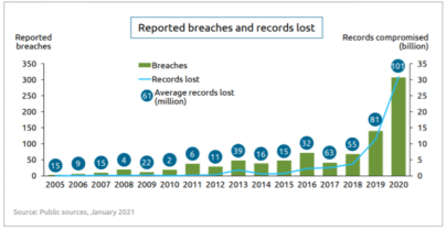 另據(jù)國外分析公司Canalys的研究顯示,2020年有310億條數(shù)據(jù)記錄被盜,被盜數(shù)據(jù)記錄比上一年增長了171%,占2005年來總共550億條被盜數(shù)據(jù)記錄的一半還多。