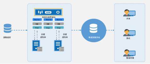 2、利用ADM數(shù)據(jù)虛擬化技術,脫敏后的數(shù)據(jù)庫掛載給到目標端讀寫,滿足開發(fā)、測試、數(shù)據(jù)分析數(shù)據(jù)使用需求,幾乎不占用存儲資源,節(jié)省存儲開支。