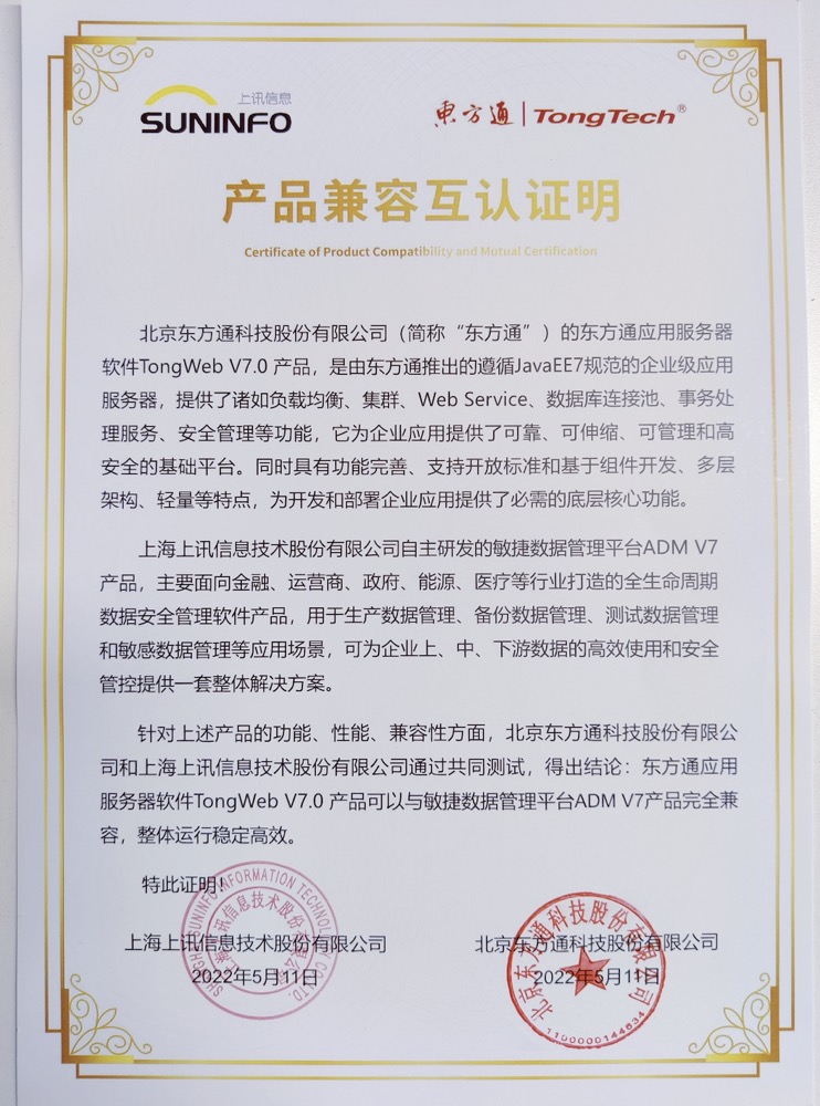 上訊信息與東方通此次的產(chǎn)品適配成功,再次驗(yàn)證了上訊信息敏捷數(shù)據(jù)管理平臺(tái)ADM產(chǎn)品的高適配性、高成熟度和高穩(wěn)定性,是上訊信息在國產(chǎn)生態(tài)環(huán)境適配中取得的又一重要成果。