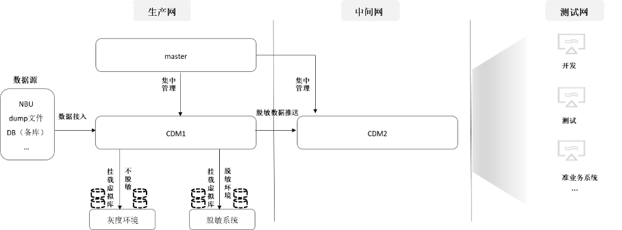 部署CDM后的數(shù)據(jù)脫敏,生產(chǎn)網(wǎng)部署一套脫敏系統(tǒng),將數(shù)據(jù)發(fā)布到生產(chǎn)網(wǎng)的脫敏環(huán)境并執(zhí)行脫敏任務(wù)后,脫敏數(shù)據(jù)利用CDM節(jié)點之間的遠程復(fù)制功能推送到中間網(wǎng),并通過中間網(wǎng)掛載發(fā)布到測試網(wǎng)。