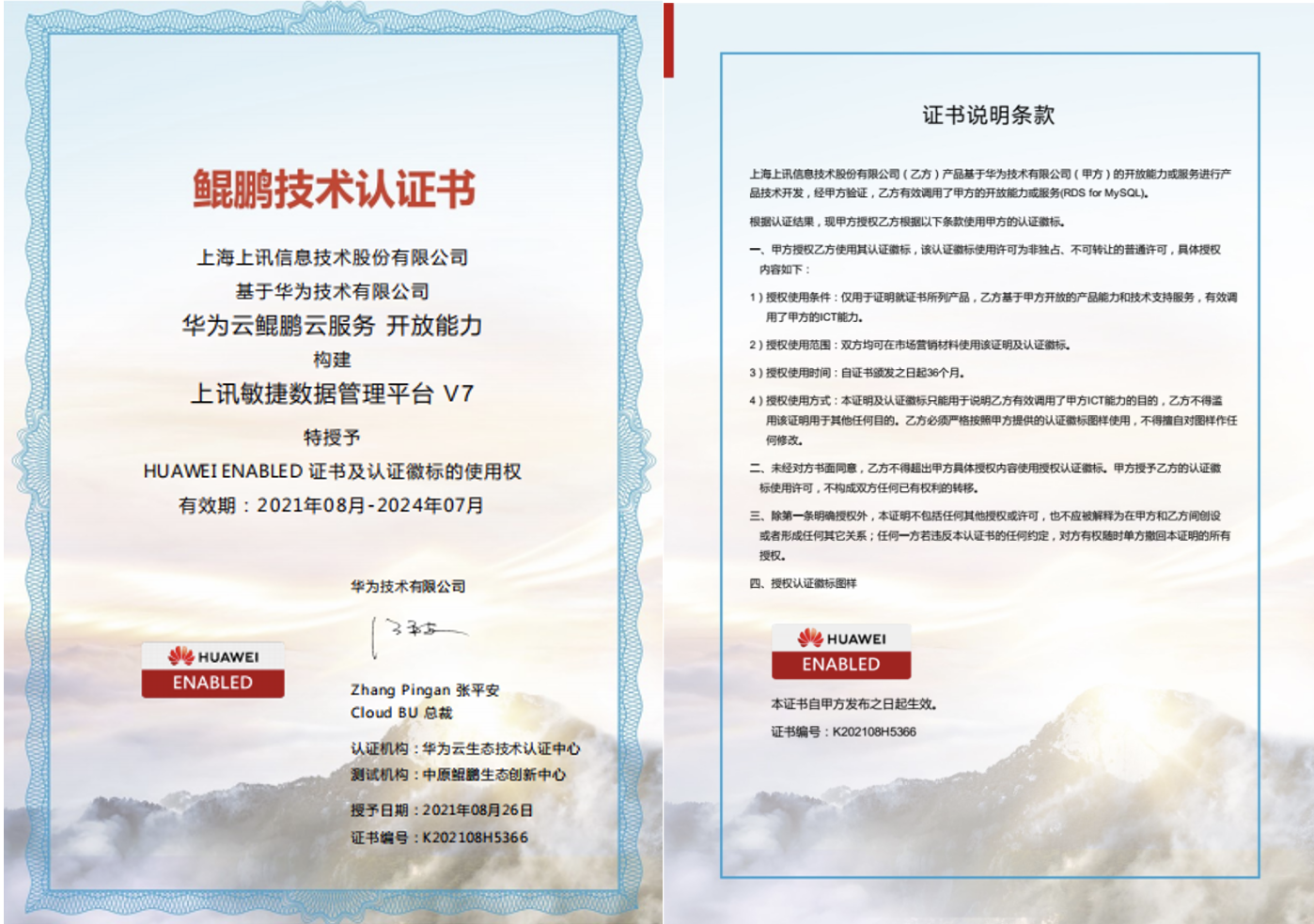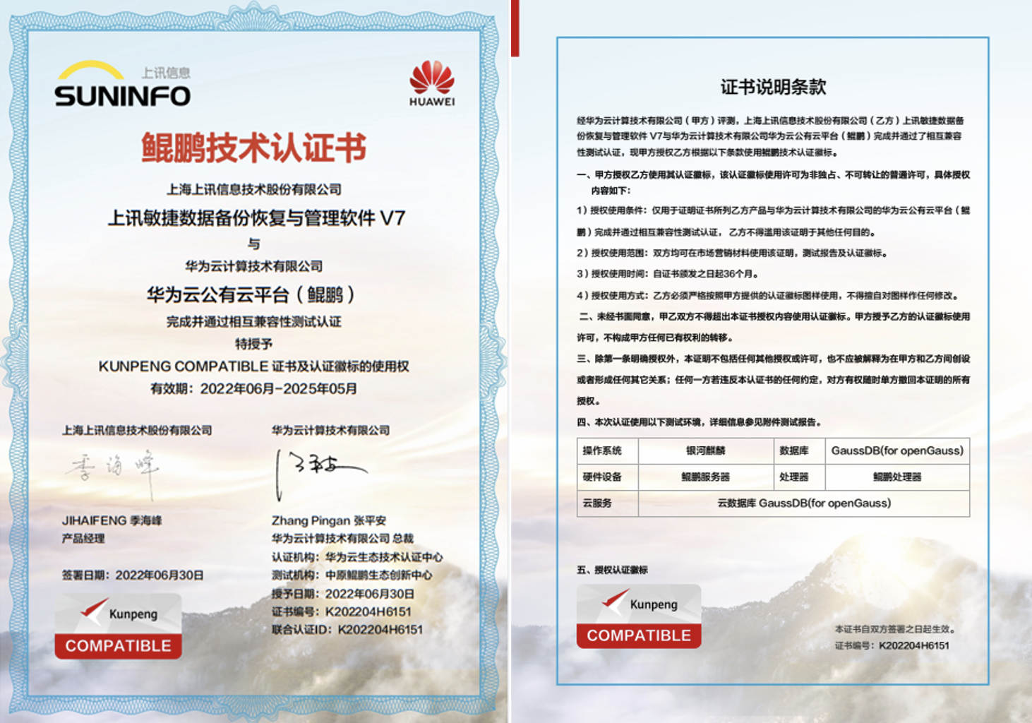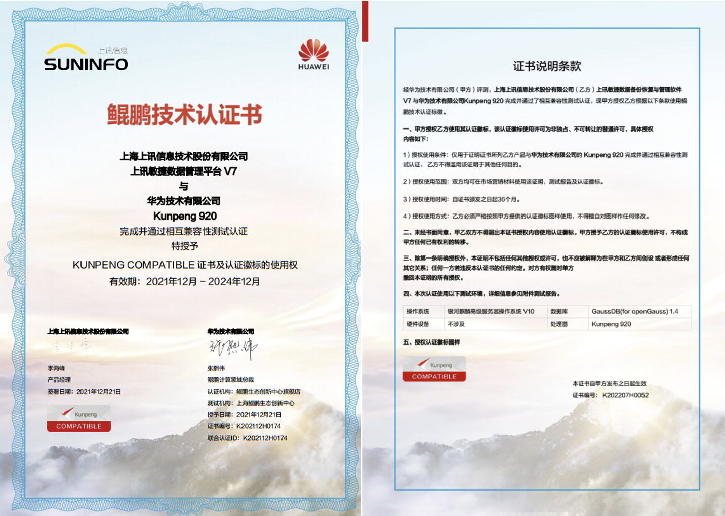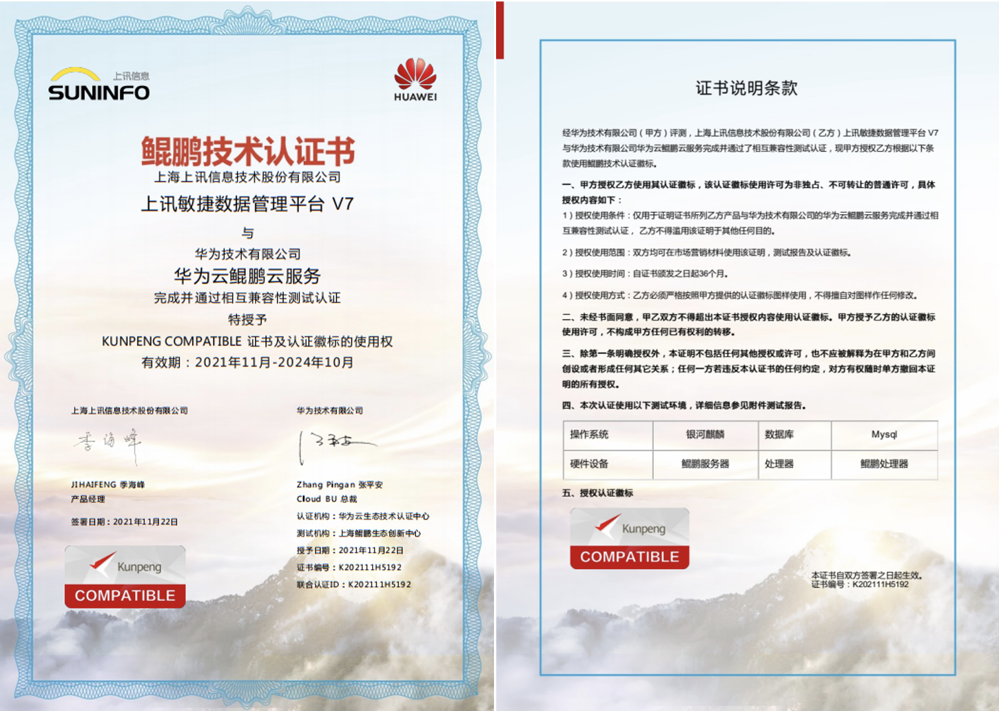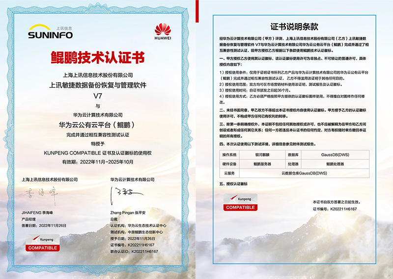 上訊敏捷數(shù)據(jù)管理平臺V7與華為技術(shù)有限公司華為云鯤鵬云服務(wù)完成并通過相互兼容性測試認證