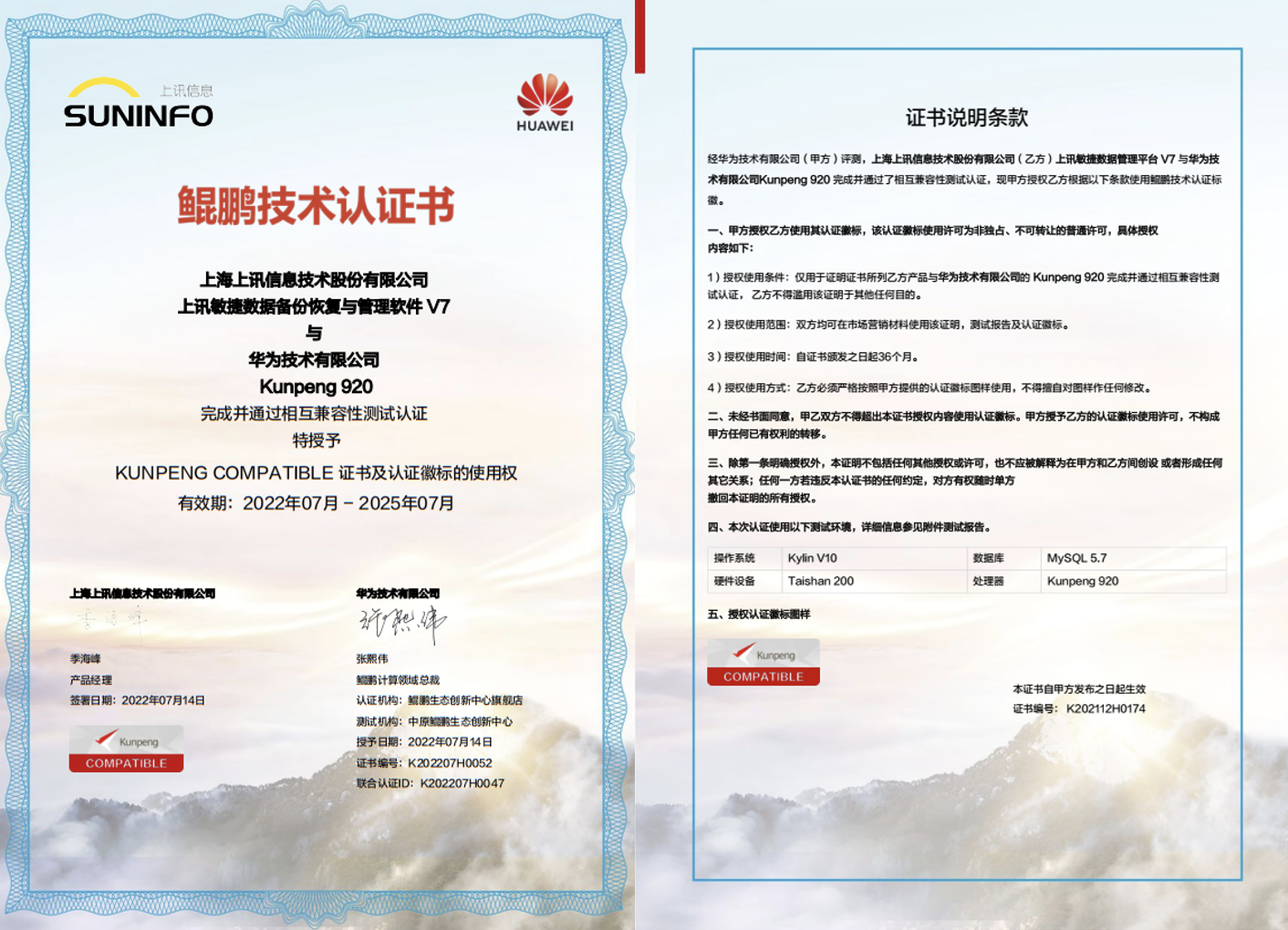 上訊敏捷數(shù)據(jù)備份恢復(fù)與管理軟件V7與華為技術(shù)有限公司Kunpeng 920完成并通過相互兼容性測試認證