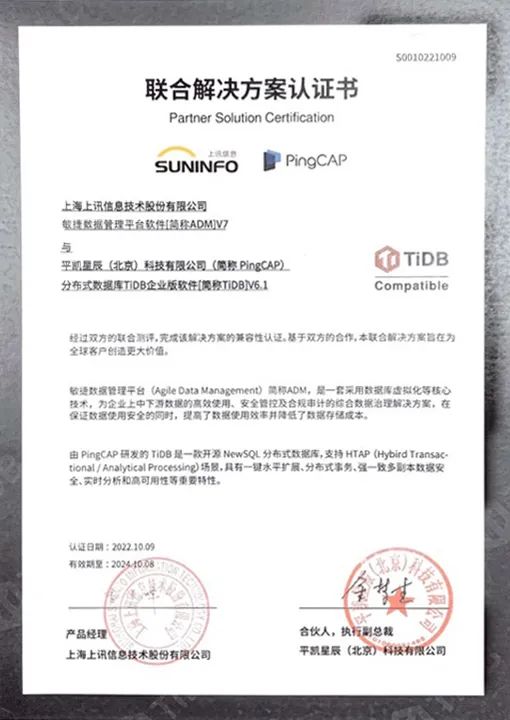 上訊信息敏捷數(shù)據(jù)管理平臺 (ADM) 與TiDB數(shù)據(jù)庫互認(rèn)證明