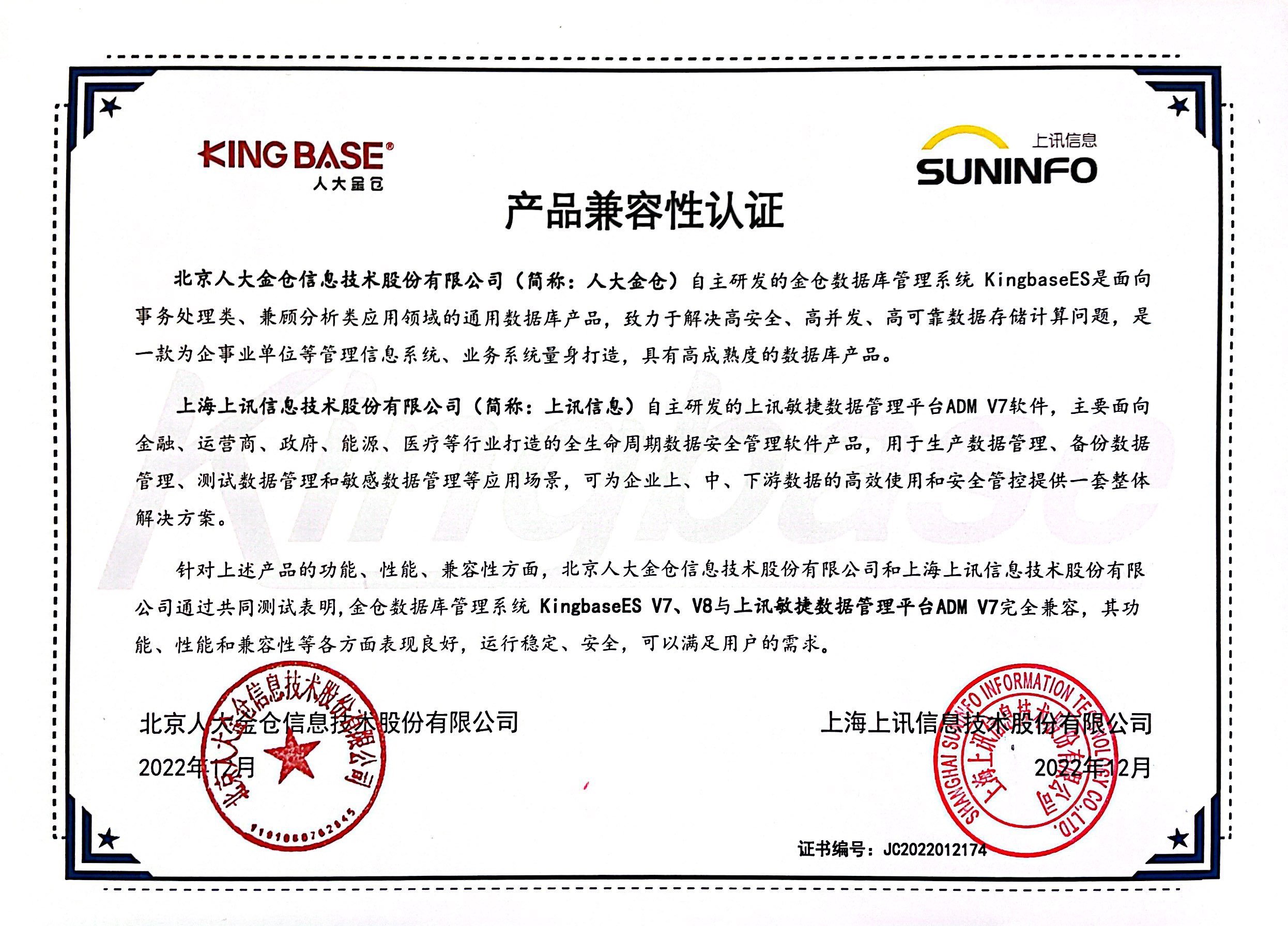上訊信息敏捷數(shù)據(jù)管理平臺 (ADM) 與人大金倉數(shù)據(jù)庫管理系統(tǒng)互認(rèn)證明