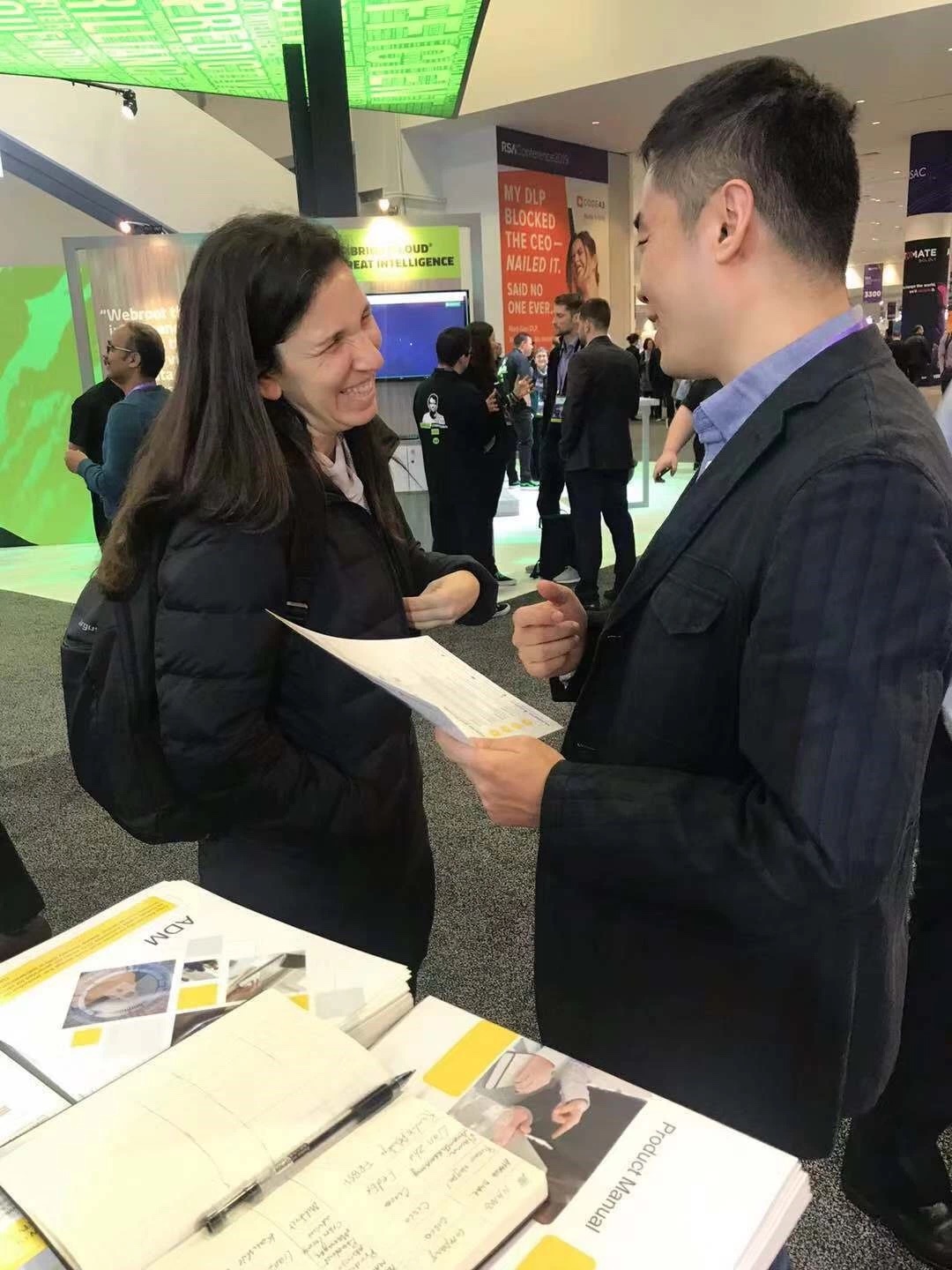 “您好,歡迎來到Suninfo,我們將為您提供對(duì)產(chǎn)品的介紹和演示……”2019年RSA大會(huì)的展區(qū)里,Suninfo的兩位總監(jiān)級(jí)技術(shù)專家正用流利的英文為眾多參觀者講解公司的產(chǎn)品,展臺(tái)的電視上循環(huán)播放著ADM的介紹短片,里面抑揚(yáng)頓挫的英式口音配音來自Suninfo北方區(qū)技術(shù)總監(jiān)劉鍇。