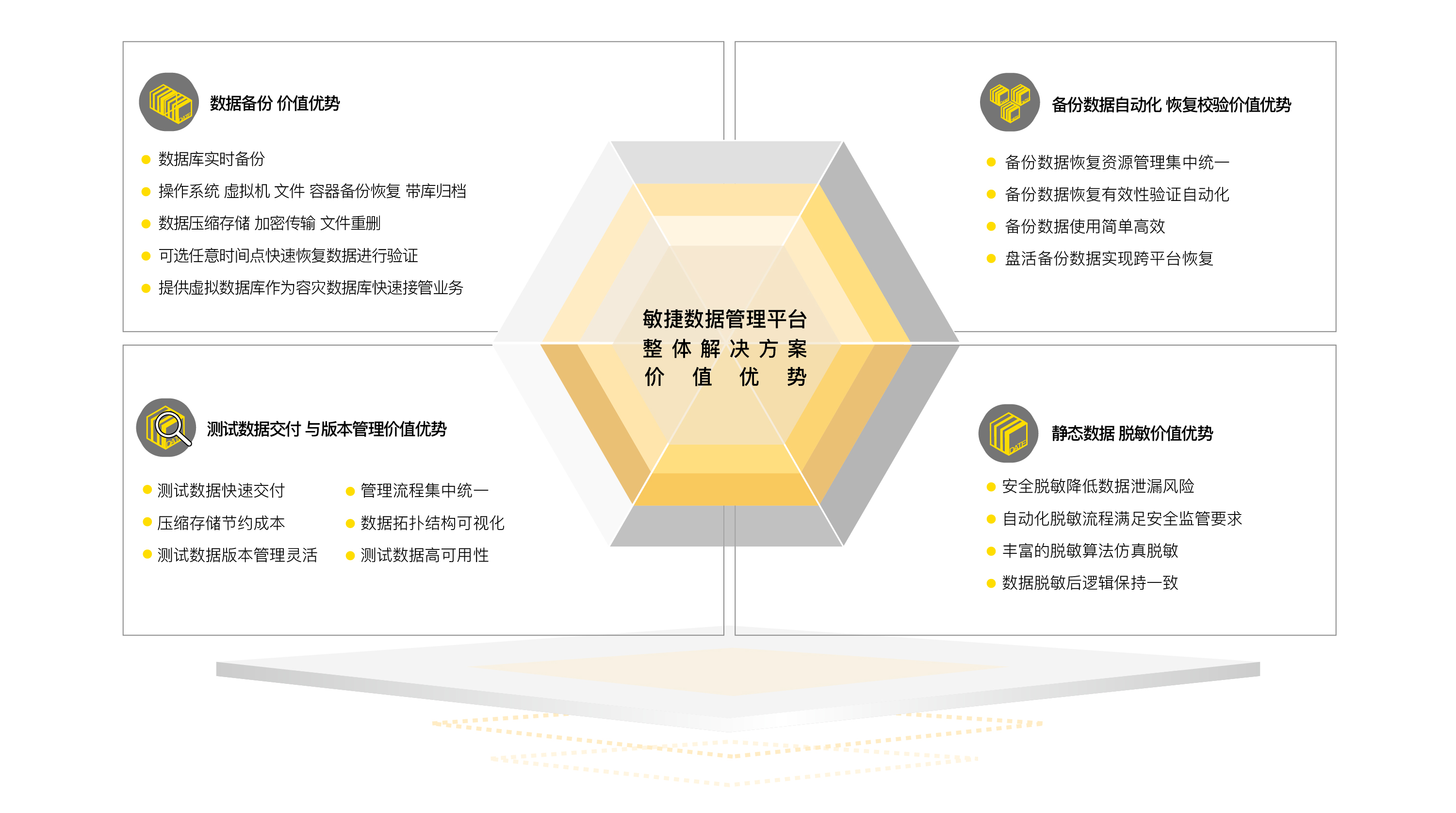 敏捷數(shù)據管理平臺(Agile Data Management,簡稱 ADM)是采用數(shù)據庫虛擬化等核心技術面向數(shù)據全生命周期的數(shù)據安全管理產品,主要由數(shù)據備份管理、備份校驗管理、數(shù)據副本管理、數(shù)據脫敏管理四大功能模塊組成,用于解決金融、運營商、能源、醫(yī)療、政府等行業(yè)的數(shù)據備份與恢復、備份數(shù)據自動化恢復與有效性驗證、靜態(tài)數(shù)據脫敏、測試數(shù)據多副本快速交付以及多場景融合下的實際問題,確保在數(shù)據安全使用的前提下,提高數(shù)據使用效率、降低數(shù)據存儲成本、減少數(shù)據泄露風險,為企業(yè)上、中、下游數(shù)據的高效使用提供一套綜合數(shù)據安全治理解決方案。