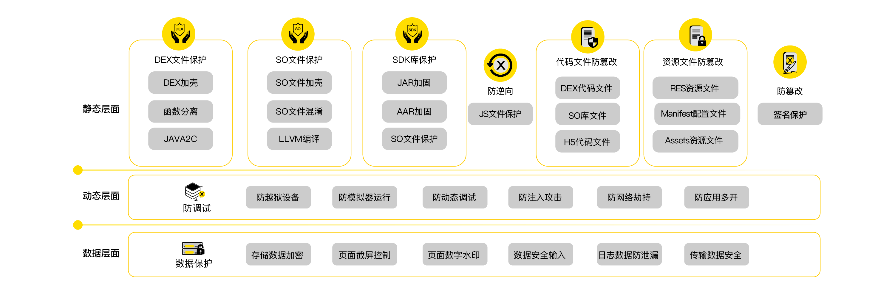 在操作系統(tǒng)原有安全體系基礎(chǔ)上,采用虛擬機(jī)保護(hù)機(jī)制、JAVA2C和白盒加密技術(shù),通過對(duì)移動(dòng)應(yīng)用程序進(jìn)行自動(dòng)化加殼,實(shí)現(xiàn)移動(dòng)應(yīng)用的防逆向分析、防動(dòng)態(tài)調(diào)試、防篡改二次打包、敏感數(shù)據(jù)保護(hù)和異常運(yùn)行環(huán)境監(jiān)測,保障企業(yè)移動(dòng)應(yīng)用程序安全。