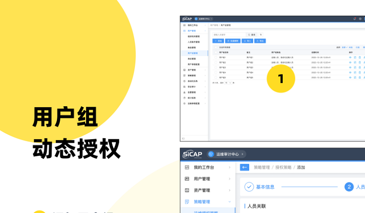 SiCAP支持將相同操作權(quán)限的人員設(shè)置為同一個用戶組,為用戶組分配相應(yīng)的權(quán)限,建立基于“用戶組”的動態(tài)授權(quán)關(guān)系,當(dāng)用戶組添加、刪減人員時,該人員自動擁有或解除用戶組對應(yīng)的授權(quán)。