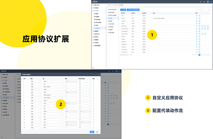 用戶通過可視化頁面可以靈活自定義數(shù)據(jù)庫、C/S、B/S 客戶端的屬性配置,從而實(shí)現(xiàn)廣泛的應(yīng)用協(xié)議接入;無論何種協(xié)議,均可通過模擬用戶鍵盤操作、屬性參數(shù)化等,進(jìn)行協(xié)議動(dòng)作流代填,實(shí)現(xiàn)資源的自動(dòng)登錄與運(yùn)維、審計(jì)。
