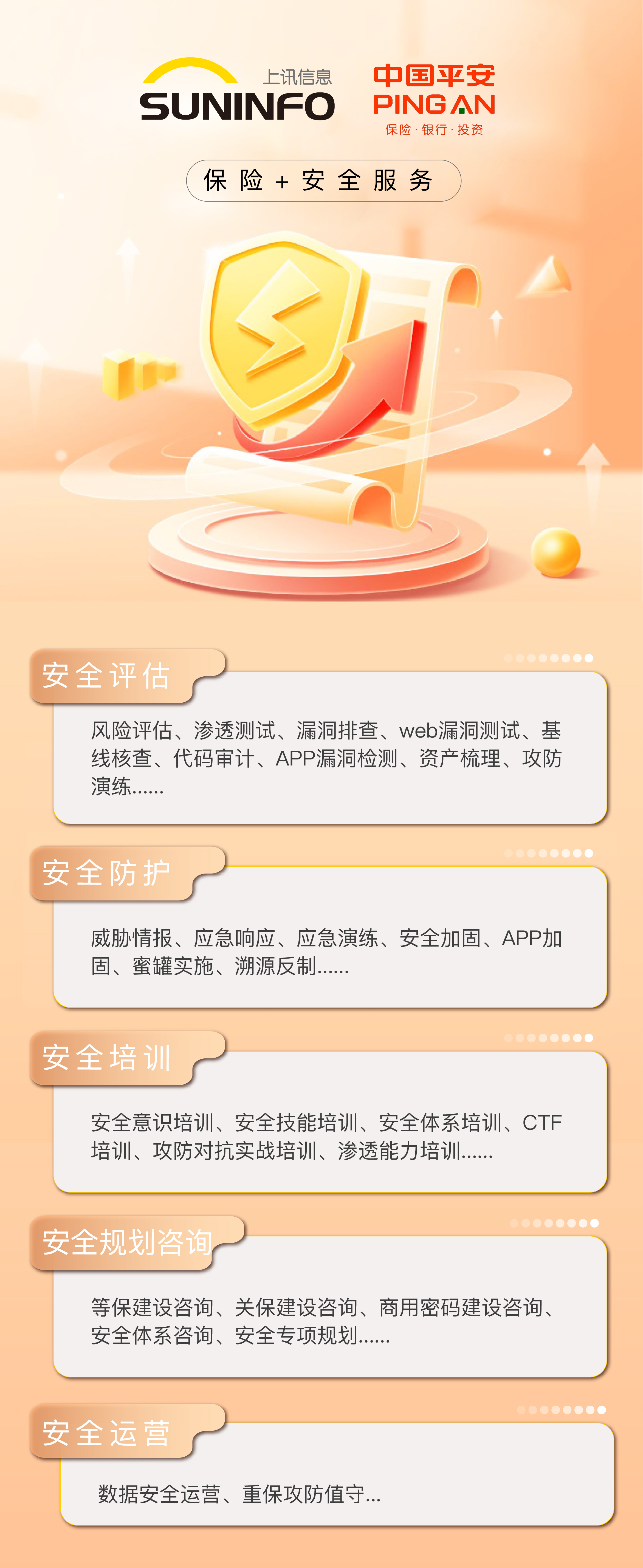 在基于中國平安財產(chǎn)保險股份有限公司“平安網(wǎng)絡(luò)安全險”基礎(chǔ)上,結(jié)合上訊信息安全服務(wù)特色,設(shè)計“保險+安全服務(wù)”的網(wǎng)絡(luò)安全保障方案。保障范圍涵蓋網(wǎng)絡(luò)安全保險風險量化及風險評級、網(wǎng)絡(luò)安全主動風險管理監(jiān)測服務(wù)、業(yè)務(wù)彈性管理及全鏈路應(yīng)急救援服務(wù)等。