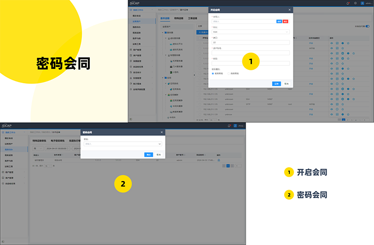SiCAP-OMA提供密碼會同功能。在運(yùn)維發(fā)起階段,由運(yùn)維人員輸入自己保管的部分密碼,再由會同人輸入剩余密碼,匯總得到完整的密碼,完成資產(chǎn)的訪問,實(shí)現(xiàn)協(xié)同操作、相互監(jiān)督,保證信息安全。