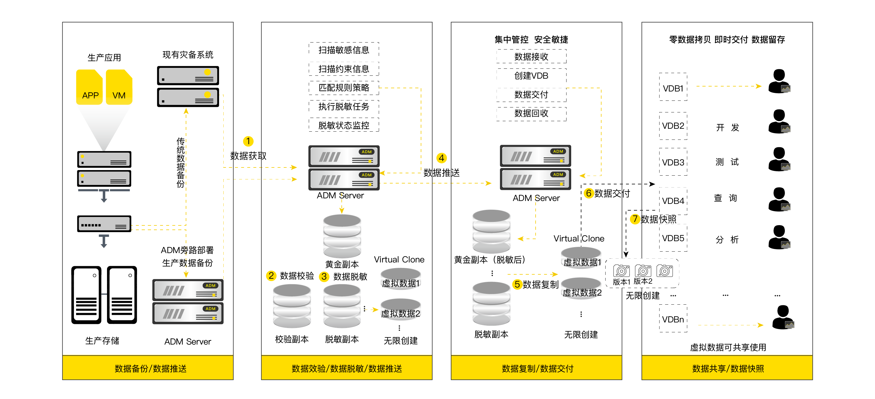 敏捷數(shù)據(jù)管理平臺ADM采用創(chuàng)新型技術(shù)——數(shù)據(jù)庫虛擬化技術(shù)幾分鐘內(nèi)創(chuàng)建完成虛擬數(shù)據(jù)庫,快速將已經(jīng)脫敏過的數(shù)據(jù)作為黃金副本傳輸?shù)介_發(fā)測試網(wǎng),有效減少開發(fā)測試場景中測試數(shù)據(jù)的準(zhǔn)備時間,提高了開發(fā)測試環(huán)境搭建的效率;
