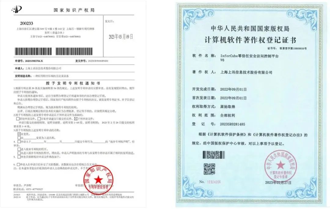在移動安全方向,新獲發(fā)明專利“一種應(yīng)用程序壓縮的方法及設(shè)備”及軟著“InforCube零信任安全訪問控制平臺V6”各一項,為公司移動安全管理平臺在同類產(chǎn)品中保持前瞻性和創(chuàng)新型進一步提供了技術(shù)支撐。