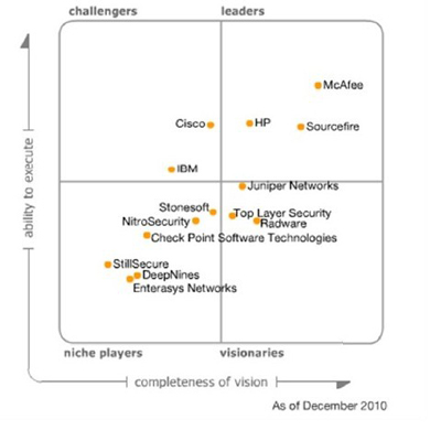 上訊信息緊密合作廠商全球最大的致力于提供網(wǎng)絡(luò)信息安全和管理的專業(yè)廠商McAfee近期宣布,其解決方案在Gartner 2010年12月發(fā)布的 “網(wǎng)絡(luò)入侵防護系統(tǒng)魔力象限”報告中被確定為領(lǐng)導(dǎo)者象限,并遙遙領(lǐng)先于其他知名廠商。