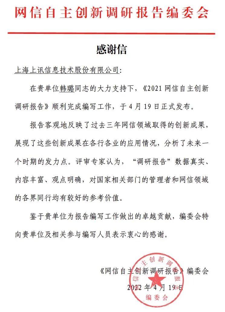 同時,上訊信息也收到了一封來自網(wǎng)信自主創(chuàng)新調(diào)研報告編委會的感謝信,鑒于我司為報告編寫工作做出的卓越貢獻(xiàn),編委會特向我司及相關(guān)參與編寫人員表示衷心的感謝。在我司韓璐同志的大力支持下,《2021網(wǎng)信自主創(chuàng)新調(diào)研報告》順利完成編寫工作,于4月19日正式發(fā)布。