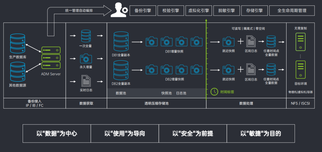 ADM產(chǎn)品對數(shù)據(jù)全生命周期的管理主要基于專有的數(shù)據(jù)虛擬化技術(shù),在數(shù)據(jù)收集和使用上,通過獲取一份具有應(yīng)用一致性保證的“黃金副本”,分鐘級虛擬化為多個副本直接掛載使用,數(shù)據(jù)使用效率明顯得到提升;在數(shù)據(jù)存儲和傳輸上,這些虛擬數(shù)據(jù)副本相對原始存儲幾乎不占用存儲空間(約為0),且ADM產(chǎn)品將全部數(shù)據(jù)集中存放在統(tǒng)一的存儲池中,既保證了數(shù)據(jù)傳輸流轉(zhuǎn)的閉環(huán)管控,又大大降低了數(shù)據(jù)的存儲成本;在數(shù)據(jù)加工上,數(shù)據(jù)脫離生產(chǎn)環(huán)境之前增設(shè)了數(shù)據(jù)脫敏環(huán)節(jié),保障數(shù)據(jù)公開后的隱私安全,防止核心數(shù)據(jù)泄露;在數(shù)據(jù)的提供和公開上,虛擬數(shù)據(jù)副本可用于準(zhǔn)生產(chǎn)、測試環(huán)境等場景的數(shù)據(jù)交付,每一份虛擬數(shù)據(jù)都是獨立的,并且可讀可寫,數(shù)據(jù)在經(jīng)過變更后可標(biāo)記快照,多個快照之間可以任意切換實現(xiàn)數(shù)據(jù)版本的管理。