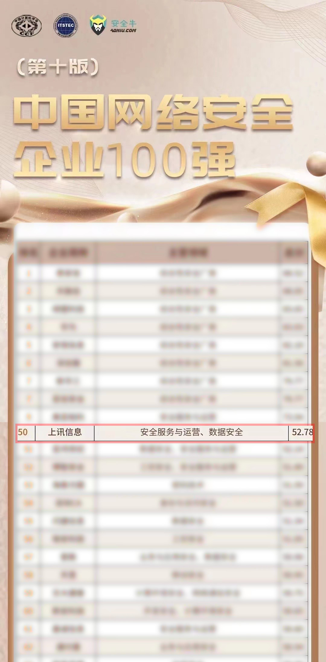 近日,安全牛發(fā)布了第十版《中國網(wǎng)絡(luò)安全企業(yè)100強》,從企業(yè)經(jīng)營、技術(shù)創(chuàng)新、行業(yè)應(yīng)用、信創(chuàng)能力四大維度,對國內(nèi)有代表性的網(wǎng)絡(luò)安全企業(yè)的綜合競爭發(fā)展能力進行研究與評價。上訊信息憑借在IT智能安全運維與數(shù)據(jù)治理、安全服務(wù)等領(lǐng)域的出色表現(xiàn)再次實力入選,位列50強。連續(xù)多年上榜中國網(wǎng)絡(luò)安全企業(yè)百強榜單,充分彰顯了上訊信息在業(yè)界強大的綜合實力和強勁的發(fā)展勢頭!