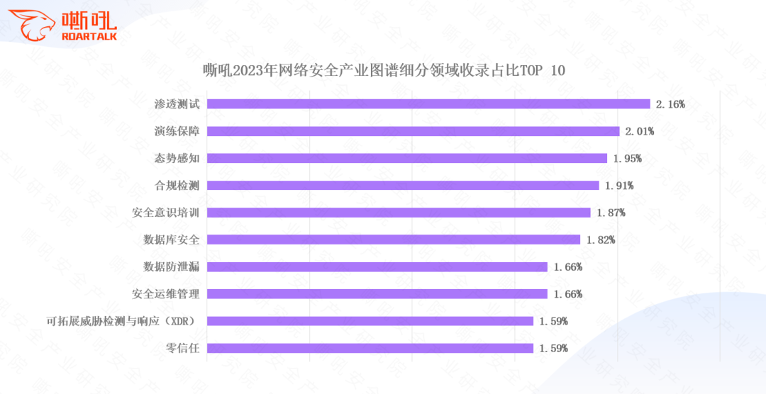 網(wǎng)絡(luò)安全產(chǎn)業(yè)是當(dāng)今數(shù)字化時(shí)代不可或缺的重要領(lǐng)域,其中細(xì)分賽道的發(fā)展更是引人注目。本次圖譜調(diào)研報(bào)告顯示,排名TOP10的細(xì)分領(lǐng)域與收錄占比分別是:滲透測試2.16%、演練保障2.01%、態(tài)勢感知1.95%、合規(guī)檢測1.91%、安全意識培訓(xùn)1.87%、數(shù)據(jù)庫安全1.82%、數(shù)據(jù)防泄露(DLP)1.66%、安全運(yùn)維管理1.66%、可拓展威脅檢測與響應(yīng)(XDR)1.59%、零信任1.59%,在網(wǎng)絡(luò)安全產(chǎn)業(yè)中占據(jù)一定的熱度與重要性。