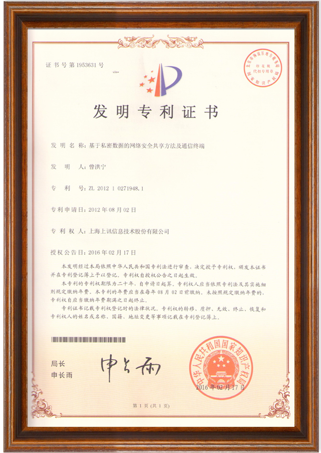 近日,上訊信息自主研發(fā)的一項科技成果“基于私密數(shù)據(jù)的網絡安全共享方法及通信終端”獲得國家知識產權局頒發(fā)的發(fā)明專利證書,授權專利號為:ZL 2012 1 0271948.1