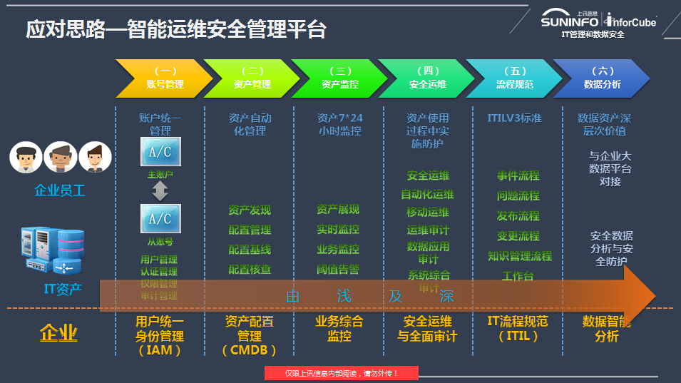此次方案涉及產(chǎn)品模塊包括:用戶統(tǒng)一身份管理(IAM)、資產(chǎn)配置管理(CMDB)、業(yè)務(wù)綜合監(jiān)控、安全運(yùn)維及全面審計(jì)、自動化運(yùn)維五大產(chǎn)品模塊。從總體控制的角度,側(cè)重于及時(shí)發(fā)現(xiàn)企業(yè)IT系統(tǒng)中的各類告警和性能異常,進(jìn)行數(shù)據(jù)分析和整合,然后通過各種報(bào)表展示出來;另一方面,維護(hù)人員借助該系統(tǒng)能夠執(zhí)行相關(guān)操作,對各種問題進(jìn)行迅速的相應(yīng),及時(shí)履行維護(hù)責(zé)任。