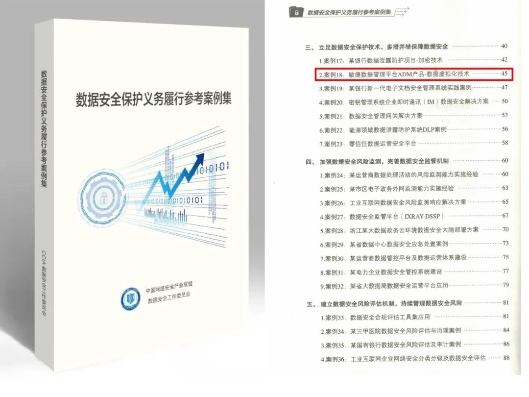 近期,由CCIA數(shù)據(jù)安全工作委員會(huì)編撰的《數(shù)據(jù)安全保護(hù)義務(wù)履行參考案例集》(以下簡(jiǎn)稱(chēng)“《參考案例集》”)正式發(fā)布。上訊信息敏捷數(shù)據(jù)管理平臺(tái)ADM產(chǎn)品——數(shù)據(jù)虛擬化技術(shù)作為“立足數(shù)據(jù)安全保護(hù)技術(shù),多措并舉保障數(shù)據(jù)安全”板塊的典型案例入選。