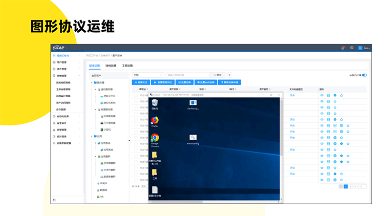 SiCAP-OMA提供圖形協(xié)議運維能力。支持RDP協(xié)議、VNC協(xié)議,滿足用戶Windows、Linux、Unix、MacOS等操作系統(tǒng)可視化運維需求。
