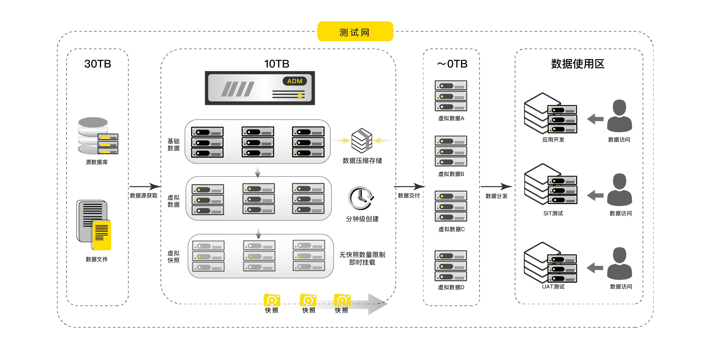 數(shù)據(jù)副本管理是ADM功能模塊之一,可實(shí)現(xiàn)副本數(shù)據(jù)管理(CDM)產(chǎn)品功能。主要通過數(shù)據(jù)庫虛擬化技術(shù)進(jìn)行生產(chǎn)數(shù)據(jù)獲取、測試基準(zhǔn)數(shù)據(jù)存儲(chǔ)、虛擬數(shù)據(jù)掛載,達(dá)到快速交付測試數(shù)據(jù)、集中管理測試數(shù)據(jù)存儲(chǔ)與流轉(zhuǎn)的目標(biāo),是主要針對企業(yè)數(shù)據(jù)運(yùn)維、軟件開發(fā)測試等部門使用數(shù)據(jù)的實(shí)際需求,滿足企業(yè)軟件開發(fā)測試部門的供數(shù)需求與測試場景,最終形成一套完整的測試數(shù)據(jù)管理解決方案。